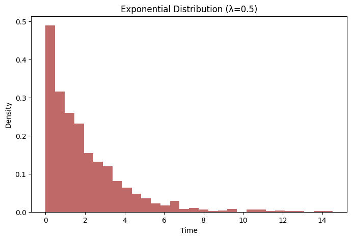 In Python, Exponential distributed data can be simulated using numpy.random.exponential(scale, size), where scale is the inverse of the rate parameter , and size is the number of samples.